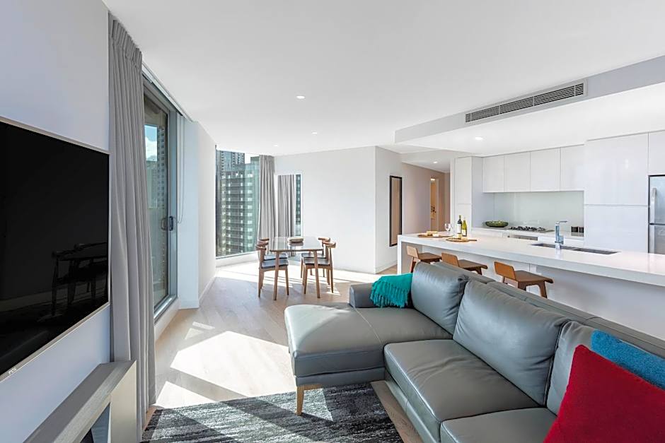 This apartment features sophisticated furnishings and generous living facilities with 2 queen beds. The apartment offers 2 bathrooms, natural light, a full self catering kitchen, laundry facilities, WiFi connectivity and your own private balcony.